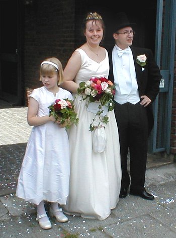| Here's a shot from my wedding on 17 June 2000, outside the church with my husband Kai Frost and my lovely bridesmaid Solveig (and my hair full of confetti!) |