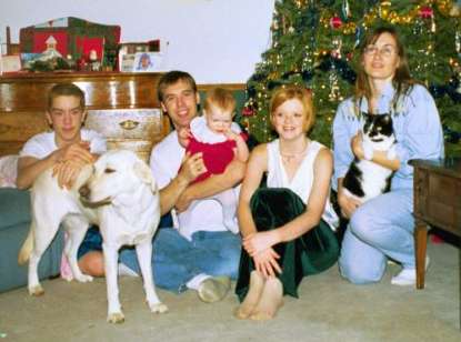 | This picture, taken by Michelle's husband at Christmas, shows her boys Matt and Aaron, daughter-in-law Emily and grand-daughter Madison. The dog is a yellow lab named Casper and the cat is Domino. And that's Michelle on the right… |